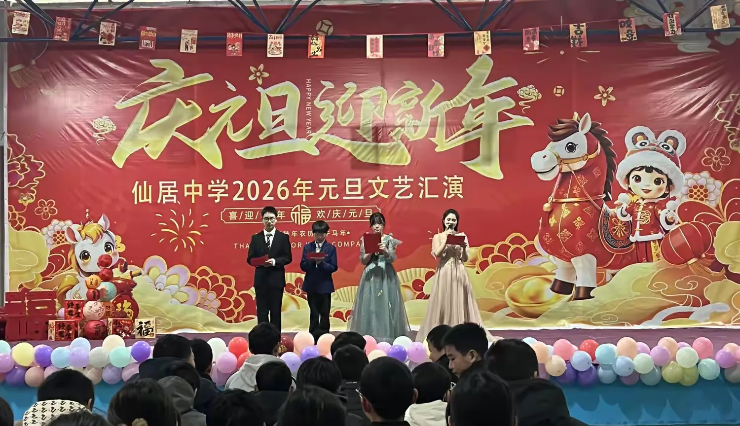 2025年12月31日中午,仙居中学2026年“星奔骏马蹄生风,少年逐梦向新程”元旦汇演在师生们的热切期盼中隆重举行,全校师生齐聚礼堂,共贺蛇年收官之喜,同绘马年奋进新篇。学校党支部书记、校长杨太付作新年致辞,他深情回顾了过去一年学校在教育教学、校园文化等方面的丰硕成果,向长期以来关心支持学校发展的各界人士致以诚挚谢意,并寄语全体师生以崭新姿态奔赴新程,续写更多精彩。